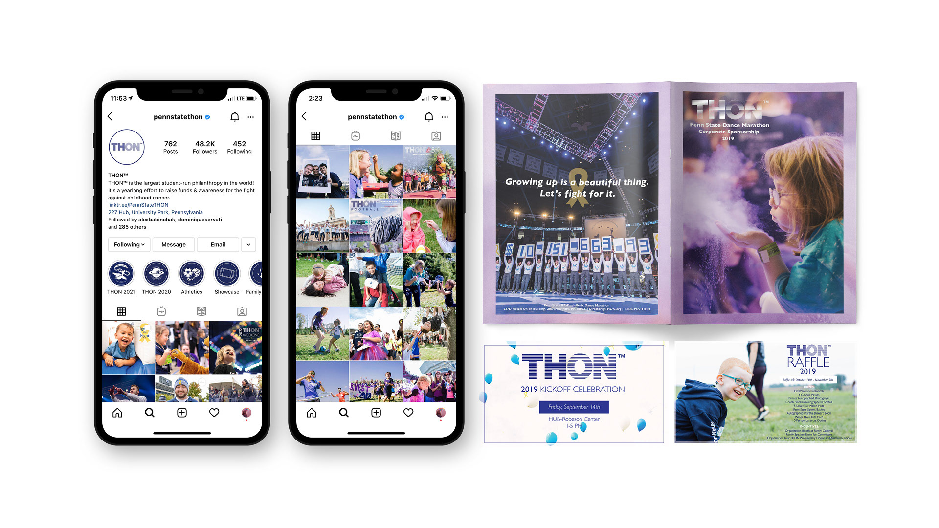 The position includes developing all graphics for THON social media accounts, with a combined total of over 180,930 followers. Above are photos of the instagram grid, including the multi-post graphic solution for the Childhood Cancer Awareness Month campaign (yellow ribbon on the far left side of the grid) from September (2018).